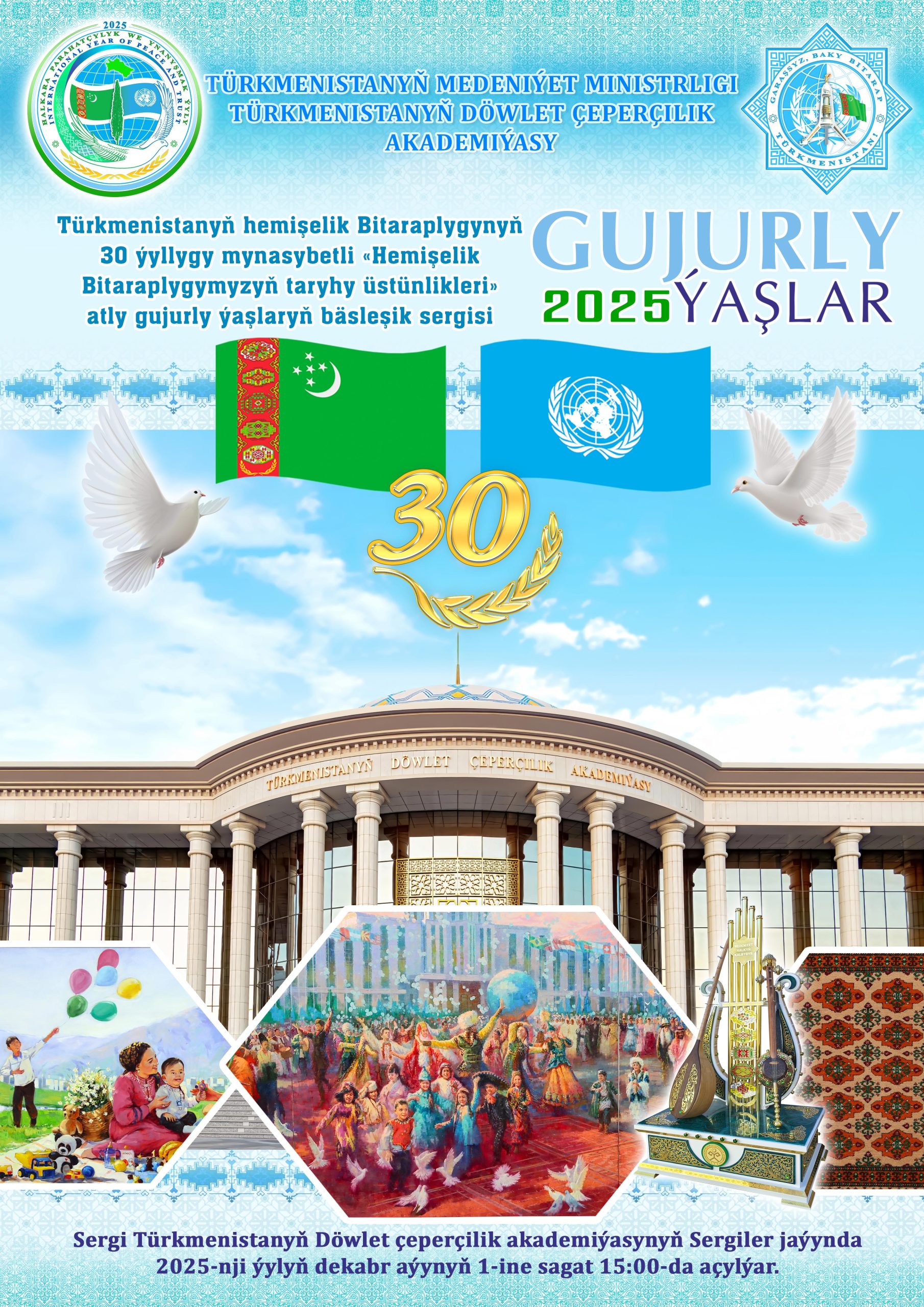 Sizi 2025-nji ýylyň dekabr aýynyň 1-ine Türkmenistanyň Döwlet çeperçilik akademiýasynyň Sergiler jaýynda sagat 15:00-da açyljak Türkmenistanyň hemişelik Bitaraplygynyň 30 ýyllygy mynasybetli «Hemişelik Bitaraplygymyzyň taryhy üstünlikleri» atly gujurly ýaşlaryň bäsleşik sergisine çagyrýarys!