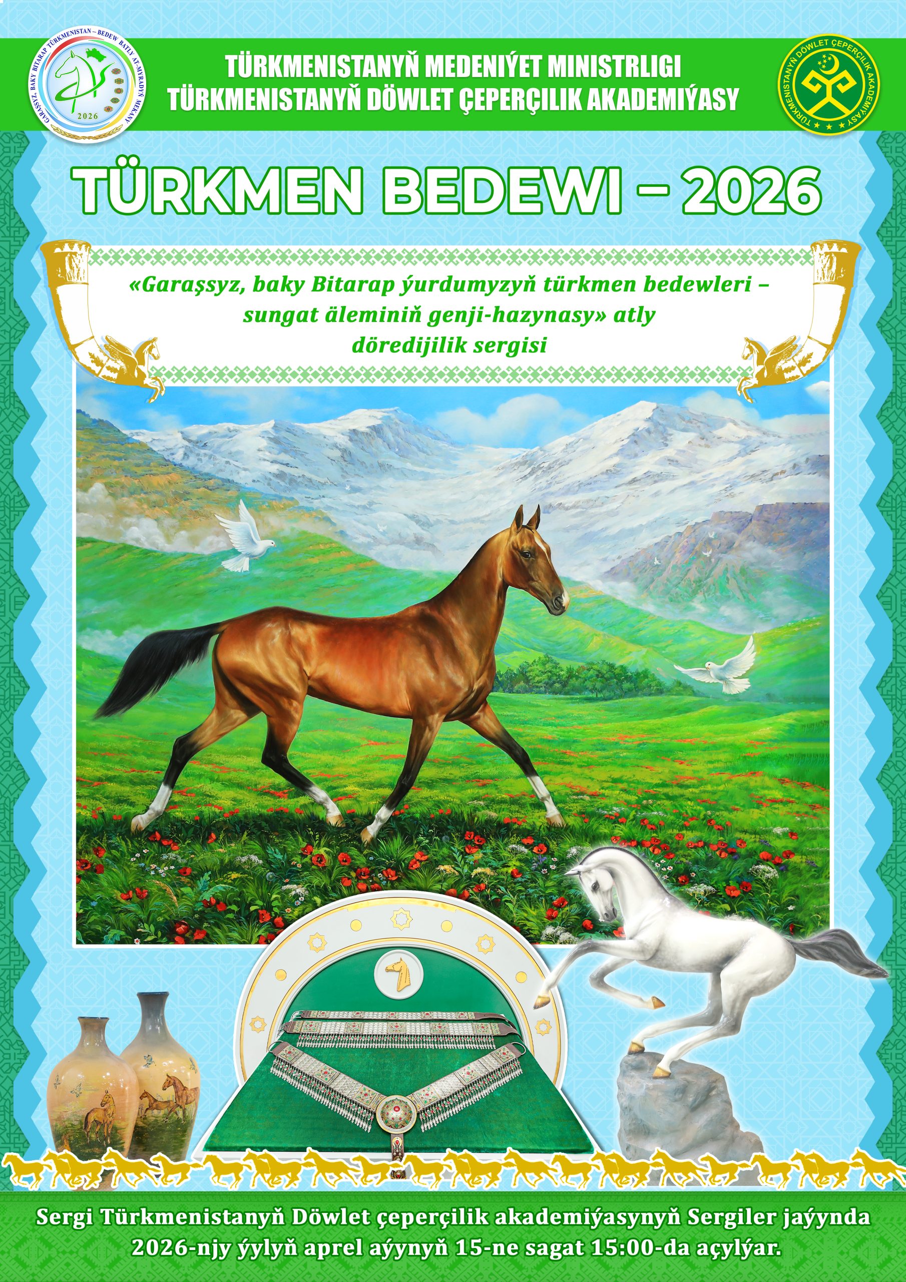 Sizi 2026-njy «Garaşsyz, baky Bitarap Türkmenistan – bedew batly at-myradyň mekany» ýylynyň aprel aýynyň 15-ne Türkmen bedewiniň milli baýramy mynasybetli Türkmenistanyň Döwlet çeperçilik akademiýasynyň Sergiler jaýynda sagat 15:00-da açyljak «Garaşsyz, baky Bitarap ýurdumyzyň türkmen bedewleri – sungat äleminiň genji-hazynasy» atly zehinli talyplaryň we mugallymlaryň döredijilik sergisine çagyrýarys!